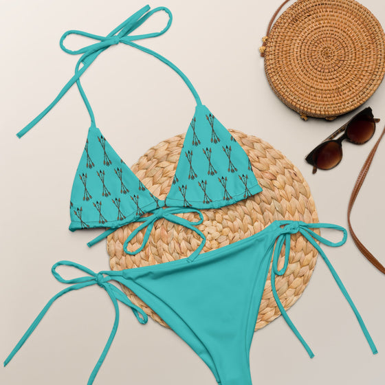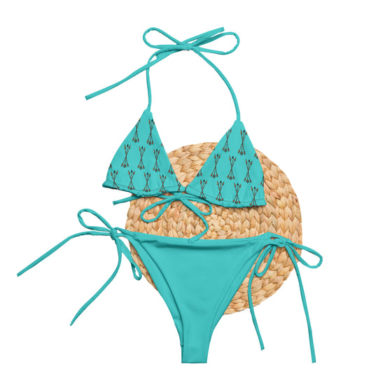 Set summer on fire with this double-layered, UPF 50+ String Bikini set. Made from soft and stretchy recycled fabrics, this eco-friendly set is badass and beautiful all at the same time! Featuring our Archery / Arrow Pattern. The combination of comfort and versatility makes this set a must-have. Lightly lined cups with removable padding.