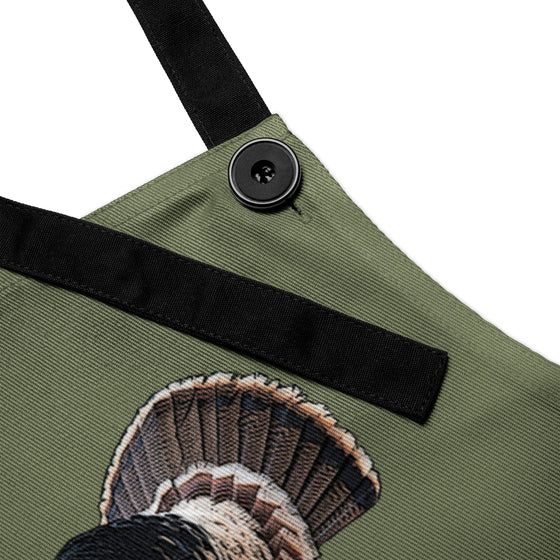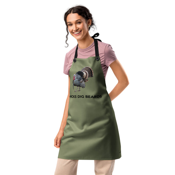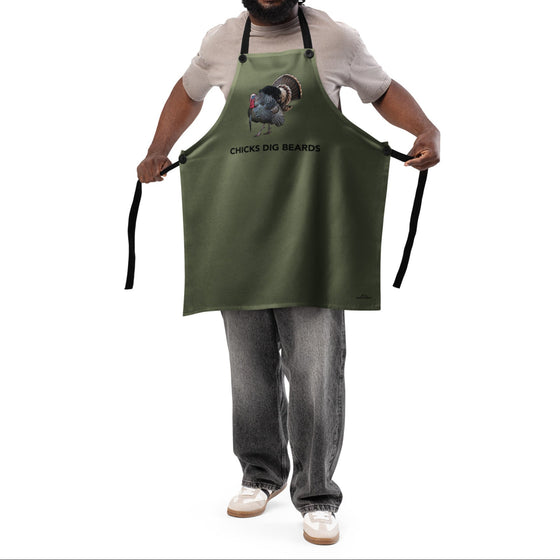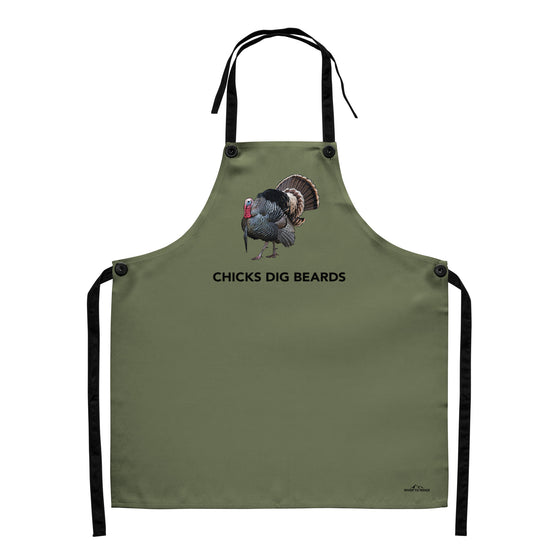 Cooking just got a whole lot cooler. This custom made apron features a clean front, button-adjustable straps, and durable fabric that withstands spills. Easy to wash when you unbutton the ties and throw in the washer! One size, all style—perfect for grilling, baking, or anything in between. Featuring our Chicks Dig Beards Turkey Hunting Logo in Olive Green.