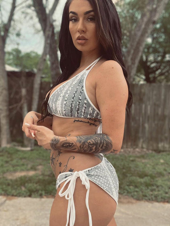 These comfortable LIMITED EDITION -UPF 50 Bikinis have our Gun Flag Pattern on one side and a silver/grey flag on the other other side. Some sizes are SOLD OUT