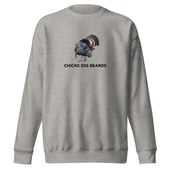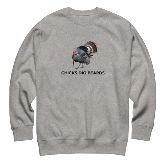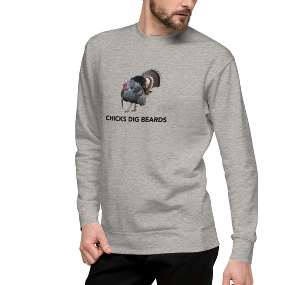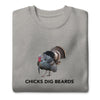 Chicks Dig Beards, Turkey Hunting Pullover. Unisex Classic sweatshirt with ribbed crew neck, long sleeve cuffs, and a flat hem. With the soft fleece inside and comfortable fit, it’ll be your favorite everyday sweatshirt. XL is the only size available all others are sold out.